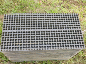 ポット育苗とは、448個(14×32穴)の区切られた播種穴がある育苗箱(大きさ30×60cm)で育苗する方式です。一穴当たり、1~3粒まきにすると、1箱15~40gの超薄播きとなり、茎の太い成苗を容易に育苗できます。また、1穴で育った苗を土ごと抜いて植えるため、根傷みがないため非常に活着が良く、1号分けつから確実に発生するようになります。